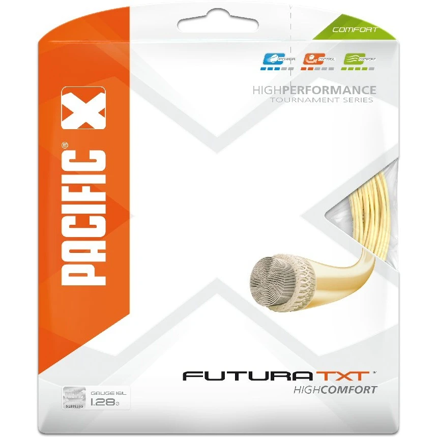 - die FUTURA TXT verwendet zwei CO-Polymer Filamentlagen, die einen aus 272 Nylon Micro-Fasern bestehenden Kern ummanteln und damit ausserordentlichen Spielkomfort, Kontrolle und Vibrationsdämfung erreicht